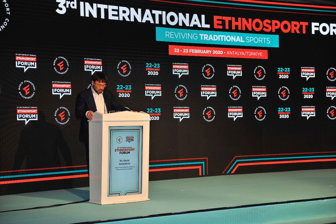 49 ülkeden aralarında bakanlar, hükümet yetkilileri federasyon temsilcileri ve akademisyenlerin bulunduğu 200 katılımcının 22-23 Şubat tarihleri arasında geleneksel sporların geleceğine ışık tuttuğu, değerli fikirleri ile katkı sağladığı forum, büyük ilgi gördü. Başkanlığını Necmeddin Bilal Erdoğan'ın yaptığı Dünya Etnospor Konfederasyonunun organize ettiği forumda birçok ülke geleneksel sporların ve oyunların geleceği için ortak çalışmalar gerçekleştirdi. Düzenlenen paneller ve oturumlarda "Geleneksel Sporların İhyasına" katkı sağlayacak önemli birçok konu masaya yatırıldı. Forumun ilk gününde açılış konuşmasını Necmeddin Bilal Erdoğan yaptı ve dünyanın farklı ülkelerinden gelen konukları selamladı. Açılış programında Gençlik ve Spor Bakanı Sayın Dr. Mehmet Muharrem Kasapoğlu, Antalya Valisi Sayın Münir Karaloğlu ve ülke gençlik ve spor bakanları söz aldı. Ardından Forum'da Dünya Etnospor Konfederasyonu Başkanı Bilal Erdoğan ve 8 Ülkenin Gençlik ve Spor Bakanları Geleneksel Sporlar Antalya Deklarasyonu'na İmza Attı. İlk gün programı paneller ile devam etti. Forum sonunda DEK Başkanı Necmeddin Bilal Erdoğan, geleneksel sporların diğer kültürlere saygı duyma ve uluslar arasında diyalog için temel bir rolünün olduğunun altını çizdi. Forum yayınlanan sonuç bildirgesinin ardından, konuklara sertifika takdimi ve kapanış konuşmaları ile sona erdi. Uluslararası Etnospor Forumu Bu Yıl Türkiye'de Düzenlendi. İlki 2018 yılında Antalya'da düzenlenen Uluslararası Etnospor Forumu'nun ikincisi 2019'da Kazakistan'ın Almatı şehrinde gerçekleştirildi. Forumun üçüncüsü bu yıl 22-23 Şubat tarihleri arasında Türkiye'nin Antalya şehrinde düzenlendi. Necmeddin Bilal Erdoğan: "Dünyanın kültürel zenginliğine dikkat çekmek istiyoruz." Açılış konuşmasında dünyanın farklı coğrafyalarından gelen misafirleri selamlayan DEK Başkanı Necmeddin Bilal Erdoğan: "Her şeyin tekdüzeleştiği ve değerlerimizin unutulmaya yüz tuttuğu bir çağda köklerimize dönmeye ve o kökler üzerinden yeniden yeşermeye ihtiyacımız var. Herkesin kendi rengi ile yaşadığı bir dünyayı ancak bu şekilde kurabiliriz." DEK Başkanı Bilal Erdoğan ve 8 Ülkenin Gençlik ve Spor Bakanları, 2020 Geleneksel Sporlar Antalya Deklarasyonu'na İmza Attı Forumda 8 ülkenin Gençlik ve Spor Bakanları, Dünya Etnospor Konfederasyonu Başkanı Necmeddin Bilal Erdoğan ile birlikte geleneksel sporların ulusal ve uluslararası çapta geliştirilmesi, desteklenmesi ve yayınlaştırılmasının sağlanması adına ortak bildiriye imza attı. Bu bildiri geleneksel sporlar tarihine "Geleneksel Sporlar Antalya Deklarasyonu" olarak geçti.